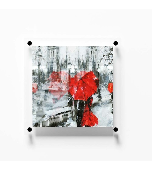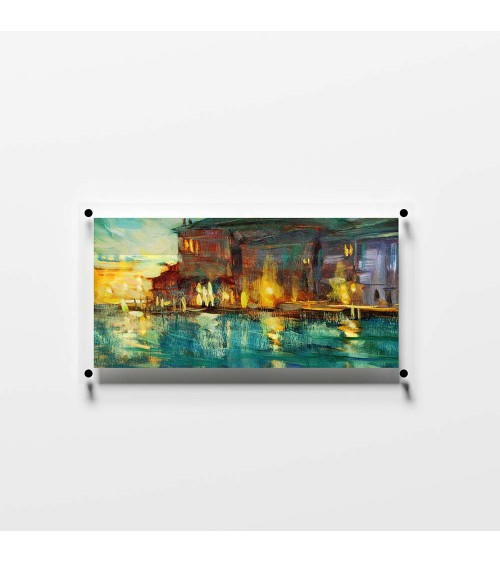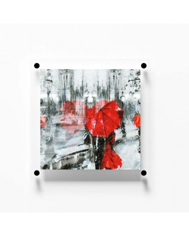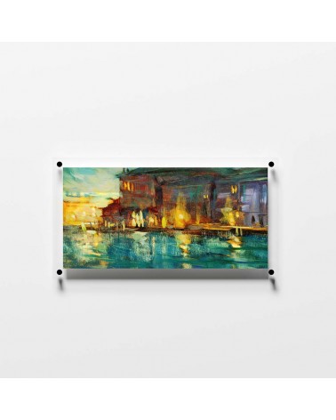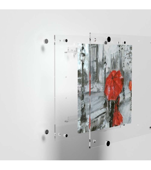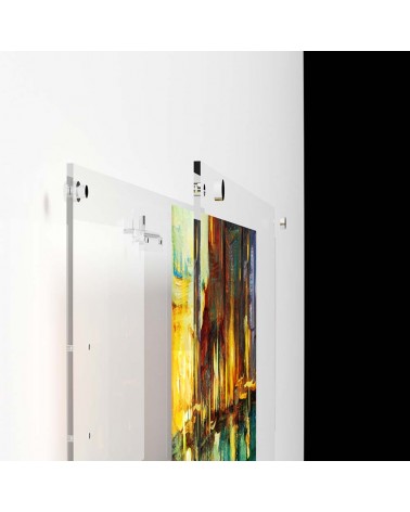 Ancoraggio e fissaggio a parete con 4 distanziali a vite, in lega non ossidabile, finitura cromo (forniti insieme alla ferramenta) per una facile sostituzione della stampa o dell'opera.